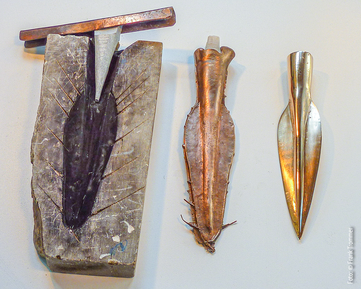 Bei dieser zweischaligen Lanzenspitzenform sieht man sehr schön die kleinen Luftkanälchen, durch die während des Gussvorganges die Luft aus der Form entweichen kann.