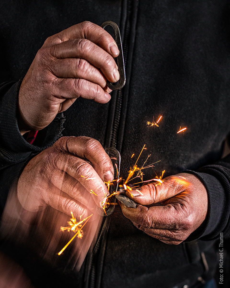 Leider besteht auch heute noch der weit verbreitete Irrtum, dass sich mit zwei Feuersteinen oder Quarziten Feuer machen lässt. Echte Zündfunken entstehen allerdings nur, wenn man mit dem Feuerstein gegen ein eisensufildhaltiges Mineral (z.B. Pyrit) schlägt. Diese entstehen dadurch, dass sich beim Schlagen kinetische Energie in thermische Energie umwandelt, die die Verbrennung der aus dem Pyrit herausgelösten Partiel aktiviert.