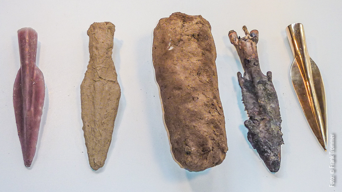 Bei dieser zweischaligen Lanzenspitzenform sieht man sehr schön die kleinen Luftkanälchen, durch die während des Gussvorganges die Luft aus der Form entweichen kann.