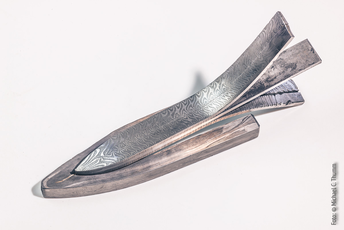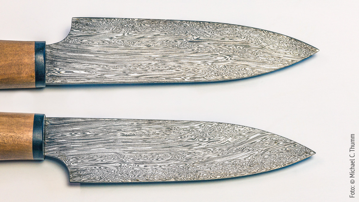 Ansicht beider Seiten eines Messers aus Expolsionsdamast