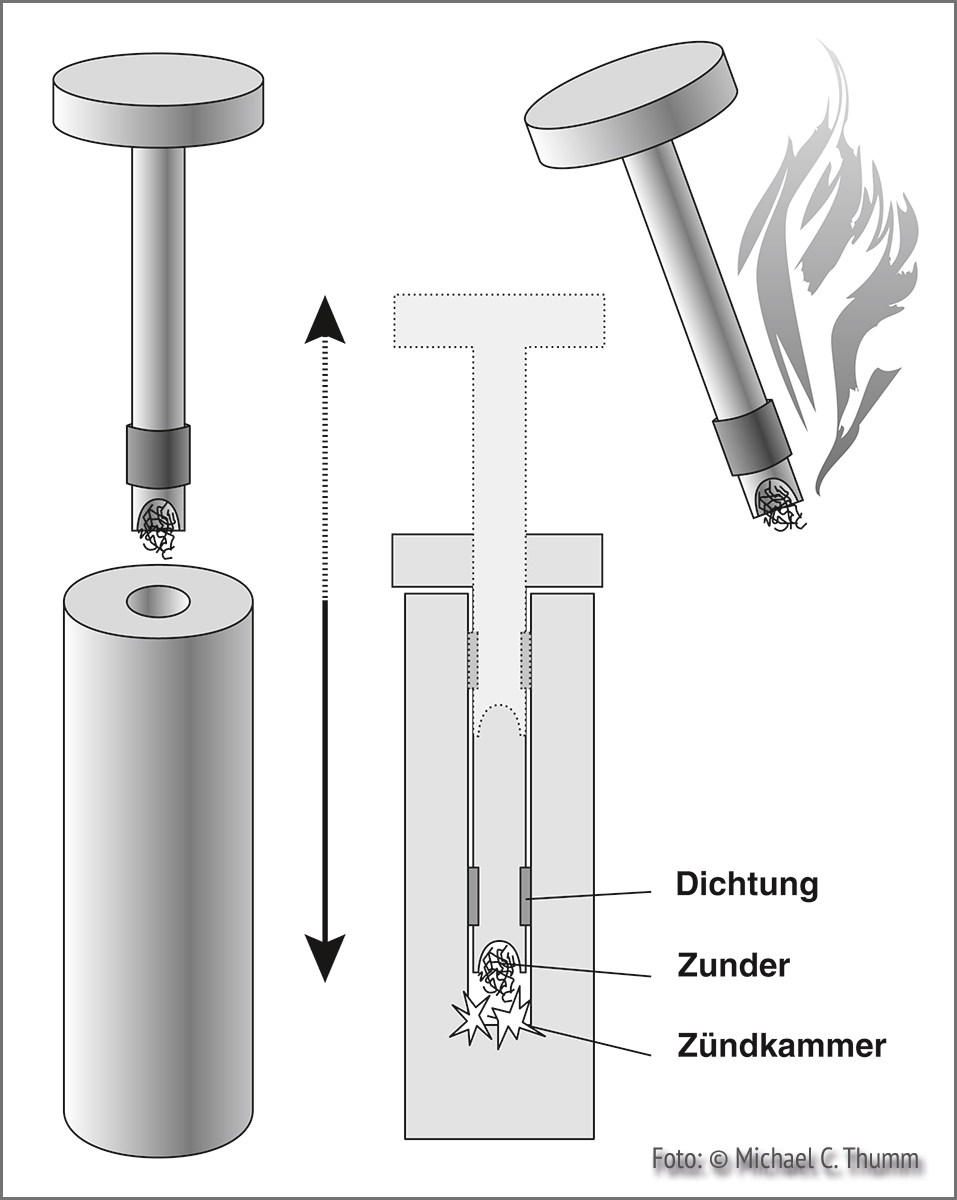 Bambus, als natürlich dichter Zylinder mag dafür verwendet worden sein. In Europa meldete der Franzose Du Montier 1770 ein Patent auf ein Kompressionsfeuerzeug an, das aber nur begrenzt Verbreitung fand. Immerhin wurde 100 Jahre später, nämlich 1892, Rudolf Diesel davon inspiriert, sich diese Technik für seinen Motor zunutze zu machen.