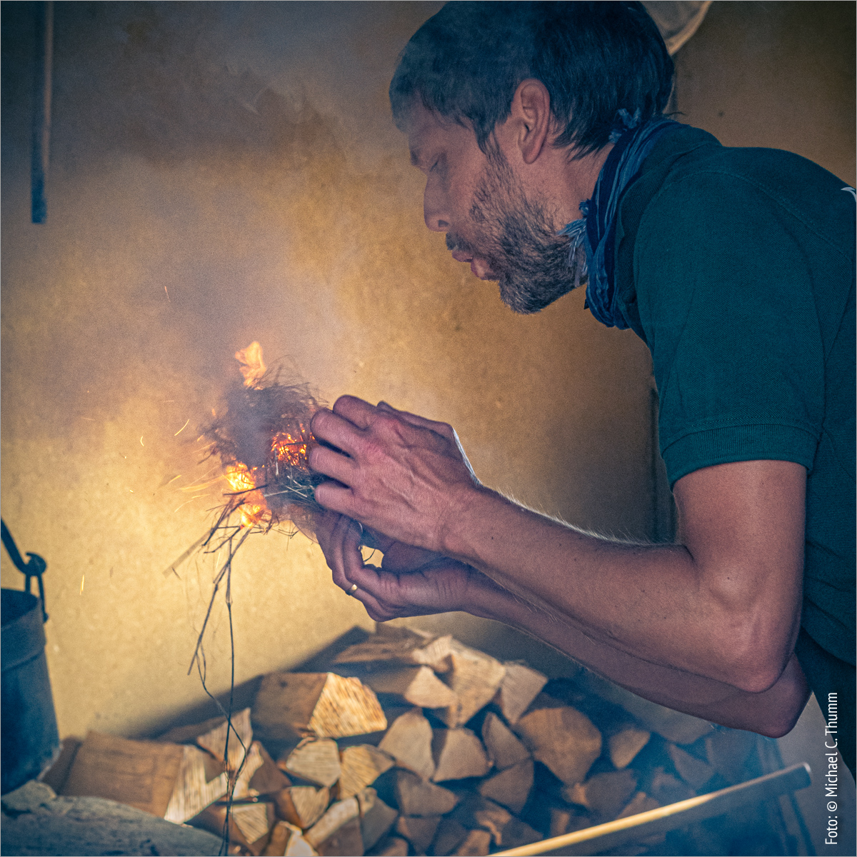 Die glühenden Funken lässt man auf ein geeignetes Zundermaterial fallen, z.B. den echten Zunderschwamm fomes fomentarius, der durch seine samtige Oberfläche und seine chemischen Eigenschaften die Funken sehr gut annimmt und weiterglimmt ohne zu verlöschen.